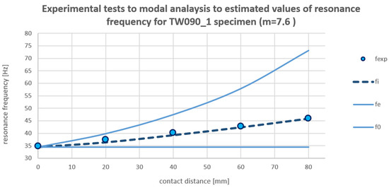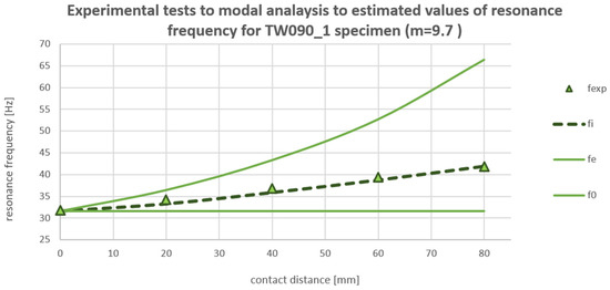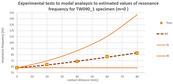 Figure 13 for TW090_1. The values that are compared together are the estimated resonance frequencies with usage of the presented formula, the values obtained in the experimental test, and the values obtained in modal analysis with always closed contact. The neglected contact values are equal to modal analysis for 0 mm contact distance (free vibration without contact).