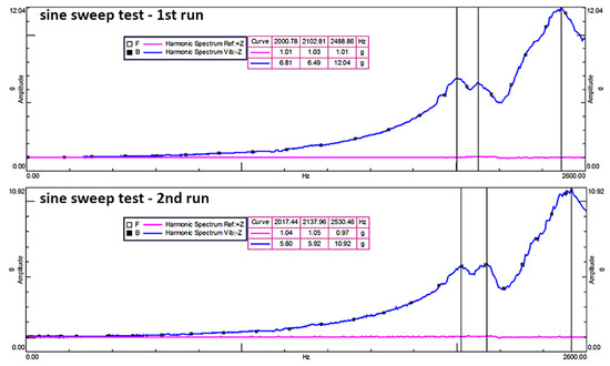 26]. The test method was sine sweep of equal enforced acceleration of the base. The tested frequency range was 20–2600 Hz with an acceleration amplitude of 1 g on the Z axis.