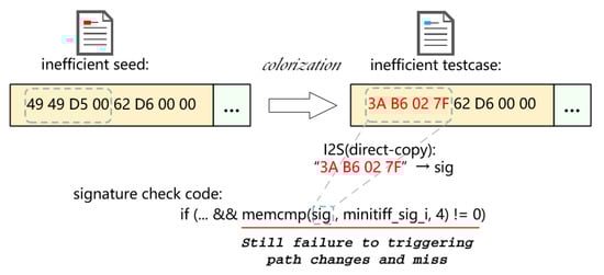 Redqueen [] and GRIMOIRE [] recognize Input-to-State (I2S) dependencies by padding random values on test case fragments, selecting fragments causing execution path changes, and performing I2S dependency analysis on them. Such a selection of fragments for dependency recognition is called colorization. The main challenge is that colorization may fail to change the code coverage, because the constraint to trigger a new branch is not satisfied. We call this limitation I2S misses for such methods, meaning missing part of the I2S fields that are supposed to be recognized. Regarding the key issues above, I2S misses will result in the incomplete recognition of the input format.
