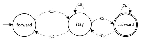 The FA contains three states, , , and , as shown in Figure 7. According to the current state, dBStack and dBMap, we locate the satisfied constraint and perform the corresponding operation, then shift to the state specified in the “Next State” column of Table 1. From the perspective of sequence generation, we start by pressing the full n-length 0 into , recursively pushing up a character at the end of the string, and always check if the last substring is repeated. If so, then we try the next character or pop the dBStack to continue the last round; otherwise, we push up the new character and start a new round. This ensures that each substring whose length is no less than n is unique in dBStack, until a new character is stacked.