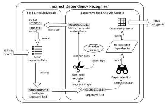 In Indirect Dependency Recognizer, after obtaining the output from I2S Recognizer, the Field Scheduling module collects all the fields that have not yet recognized dependencies and schedules these suspensive fields in a half-interval manner. The Suspensive Field Analysis module performs the Non-deps exclusion method on long fields to identify and exclude the non-deps fields and the Deps detection method on short fields to recognize indirect dependencies.