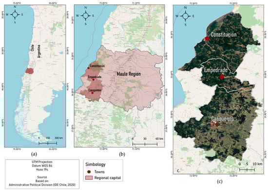 (a) Location of the study area in Chile. (b) Location of the study area on a regional scale. (c) Communal scale study area.