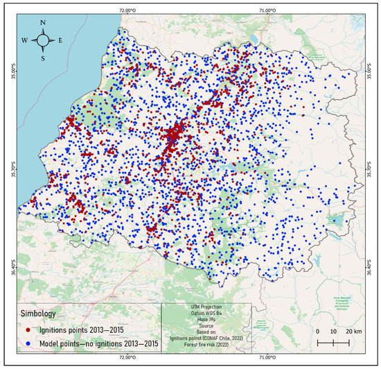 We obtained 3784 points, of which 1892 indicate the ignition of forest fires between 2013 and 2015 in the Maule region; these correspond to the red points in Figure 2. The 1892 blue points generated by the model represent areas with no ignition in the same period.