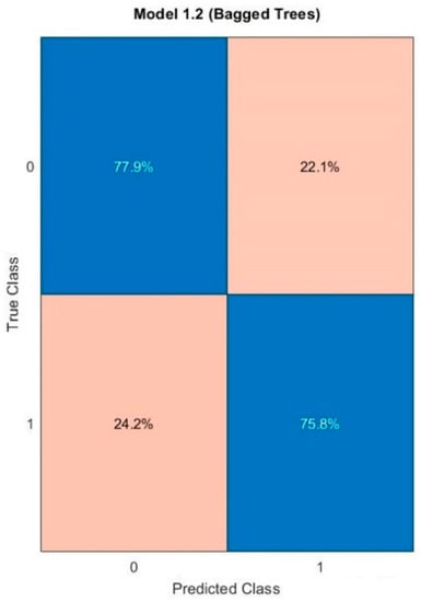 Another measure of the model’s effectiveness is the confusion matrix, which indicates the level of correct and incorrect classifications. In Figure 5, we can observe that 75.8% of values 1 (ignition) and 77.9% of values 0 (not ignition) were correctly classified.