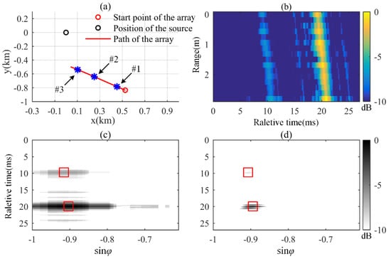 The data from an experiment in the Yellow Sea of China in 2019 were processed for testing the proposed and reference methods. A 2.8 m movable horizontal array was used. The horizontal array had 16 elements. The sampling frequency was 20 kHz. The source was fixed as shown in Figure 3a. The source transmitted wideband noise within a frequency band of 2–4 kHz. Both the source and the horizontal array were located at a depth of 5 m. The trajectory of the horizontal array is shown in Figure 3a.