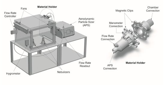 The experiments were conducted using a custom-built aerosol chamber (0.56 m × 0.52 m × 0.42 m) [] with two 3D printed material holders attached. Two medical nebulizers (VixOne Small Volume Jet Nebulizer, Westmed, Tuscon, AZ, USA) were placed in the chamber. One of the nebulizers was used to generate polydisperse NaCl aerosols. The aerosolization was stopped when the particle concentration reached 900 to 1200 particles/cc, measured by the Aerodynamic Particle Sizer (APS 3321, TSI, Shoreview, MN, USA). The second nebulizer controlled the RH inside the chamber set to RH of 30%, 50%, or 70%. The two mixing fans inside provided homogeneous particle distribution in the chamber [,]. A 3D rendering of the aerosol chamber and the position of these components are shown in Figure 2(left).