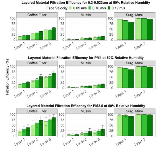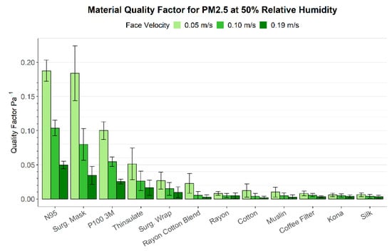 The following supporting information can be downloaded at: https://www.mdpi.com/article/10.3390/app12189360/s1, Figure S1: Photos of some of the tested materials. Listing the materials starting from the top left and moving across are: Kona, Muslin, Cotton, Rayon, Rayon Cotton blend, and Surg. Wrap; Figure S2: Pressure drop results for layered materials as a function of RH. Bar colors represent the corresponding RH value and results are plotted as the average pressure drop from three runs, with the error bars representing the standard deviation; Figure S3: Filtration efficiency results for single layered materials as a function of relative humidity. Bar colors represent the corresponding RH values with the results plotted at the average filtration efficiency from three experimental runs with the error bars representing the standard deviation; Figure S4: Filtration efficiency results for layered materials as a function of relative humidity. Bar colors represent the corresponding RH values with the results plotted at the average filtration efficiency from three experimental runs with the error bars representing the standard deviation.; Figure S5: Quality factor results for layered materials when face velocity is varied. The quality factor results use the average filtration efficiency and pressure drop readings taken from three experiments to calculate three individual quality factor values. Error bars in the figure represent the standard deviation across these three quality factor values while the bar colors represent the corresponding face velocity values; Table S1: Material list, description, and average filtration efficiency, pressure drop, and quality factor values. Materials are listed from highest quality factor to lowest. Average and standard deviation values are calculated across three experiments.