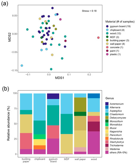 - Dedesko, S.; Siegel, J.A. Moisture parameters and fungal communities associated with gypsum drywall in buildings. Microbiome 2015, 3, 71. [Google Scholar] [CrossRef] [PubMed]