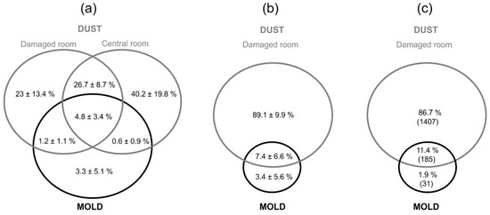 - Pitkäranta, M.; Meklin, T.; Hyvärinen, A.; Nevalainen, A.; Paulin, L.; Auvinen, P.; Lignell, U.; Rintala, H. Molecular profiling of fungal communities in moisture damaged buildings before and after remediation—A comparison of culture-dependent and culture-independent methods. BMC Microbiol. 2011, 11, 235. [Google Scholar] [CrossRef]