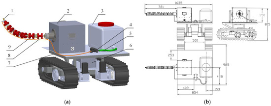 (a) The overall model of the CDTSR: (1) nozzle; (2) cable-driven manipulator control box; (3) pesticide box; (4) diaphragm pump; (5) inlet pipe; (6) track vehicle control box; (7) track vehicle; (8) outlet pipe; (9) cable-driven manipulator. (b) CAD drawings with different viewing angles of the CDTSR (the unit is mm).