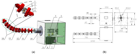 (a) The overall model of the CDFM: (1) tendon; (2) support; (3) graphite copper sleeve; (4) shaft; (5) reel; (6) pulley; (7) cooling fan; (8) coupling; (9) stepper motor; (10)flange base; (11) connecting rod; (12) proximal arm segment; (13) distal arm segment; (14) cable locking. (b) CAD drawings with different viewing angles of the CDFM (the unit is mm).
