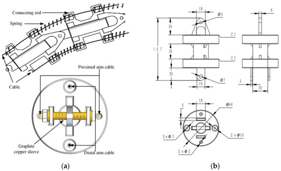 The manipulator had six joints, each with the same structure; a single joint structure is shown in Figure 4a. The adjacent connecting rod was connected using a spring and hinge structure, which could transfer force through the spring. Therefore, it only needed to apply tension on the last connecting rod in the arm segment to make each joint rotate, thereby reducing the number of driving motors required and the difficulty of control. The shaft hole and shaft of the support were connected with a graphite copper sleeve to reduce the friction at the joint. The CAD drawings of the connecting rod are shown in Figure 4b.