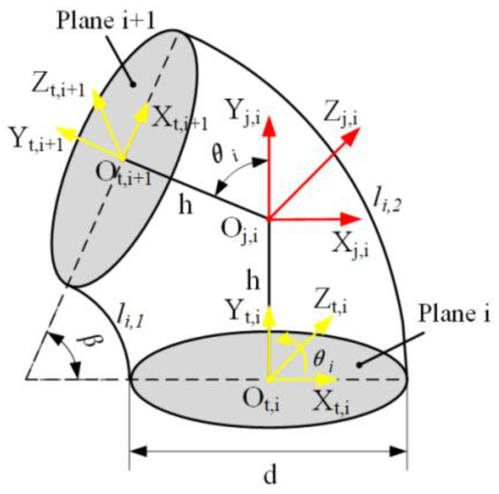 To describe the kinematic relation between the cable and the joint of the CDFM, the tendon joint was assumed to have a constant curvature, thus allowing us to create a geometric model based on a constant-curvature assumption, as shown in Figure 6. The coordinate systems {O,i} and {Ot,i+1} existed in the center of the two discs with their Y-axes in the normal direction of the disc and X-axes and Z-axes in the radial direction of the disk. The coordinate system {Oj,i} was in the center of the hinge with the same posture as the coordinate system {Ot,i}.