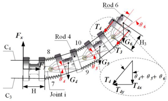 where is the elastic force of the spring 2i; , , and respectively represent the gravity of rods 4, 5, and 6; is the distance vector of the gravity-resultant force point of rods 4, 5, and 6; is that of rods 5 and 6; and is the distance vector of the gravity point of rod 6. Based on formulas (2), (5), and (6), the relationship of the joint angles between the adjacent rods in the same segment was as follows: