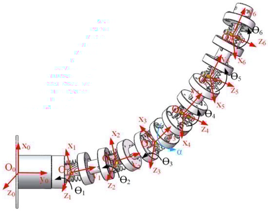 To obtain the position and attitude of the end of the CDFM, the kinematics model was established based on the D-H method using a transformation matrix. The coordinate system of the flange foundation O0 was named as the base frame {O0} and the coordinate system of each joint was named as {O1}, {O2}, {O3}, {O4}, {O5}, and {O6}, as shown in Figure 8. The origin of the coordinate system was the centroid of the joint. When the joint angle of each joint was 0°, the coordinate systems {O1}, {O2}, and {O3} were completely in the same direction and the coordinate systems {O4}, {O5}, {O6} were completely in the same direction.