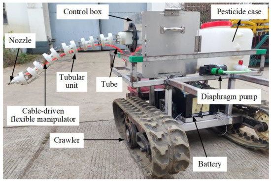 The CDTSR was designed in view of the above working environment. As shown in Figure 2, it mainly consisted of a tracked mobile platform, CDFM, and spray system. In addition, the manipulator and spray system were an integrated structure that can be directly installed on appropriate mobile platforms. The nozzle of the spray system was equipped at the end of the manipulator, the spray angle and distance of which could be adjusted.