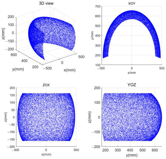 The radius of the tubular unit was 40 mm and the distance from the adjacent end plate was 32 mm. Based on the established kinematics equation, the reachable space of the robot was obtained by using the Monte Carlo random point method, as shown in Figure 10. From a fixed base, the reachable workspace was semispherical.
