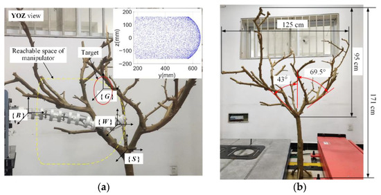 The repeated location accuracy measured by using the dial gauge was 0.532. To test the flexibility of the CDFM, a branch obstacle avoidance experiment was designed. The CDFM needed to circumvent the branches and enter into the tree canopy to achieve target spraying. The reachable space and position of the manipulator to the model tree are shown in Figure 11a; the size of the model tree is shown in Figure 11b. The 3D model of the model tree was established by using a Ready Scan B11 3D scanner and placing the model tree and the manipulator under the same coordinate system. According to the coordinate position of the obstacles, the motor rotation angle was obtained by using the established kinematics model. Through programming of the upper machine, the motion trajectory of the manipulator was determined. Then the manipulator could avoid obstacles according to predetermined trajectory. The sensor and camera could also be installed to realize automatic obstacle avoidance. However, a method to achieve a more effective automatic obstacle avoidance remains to be explored.