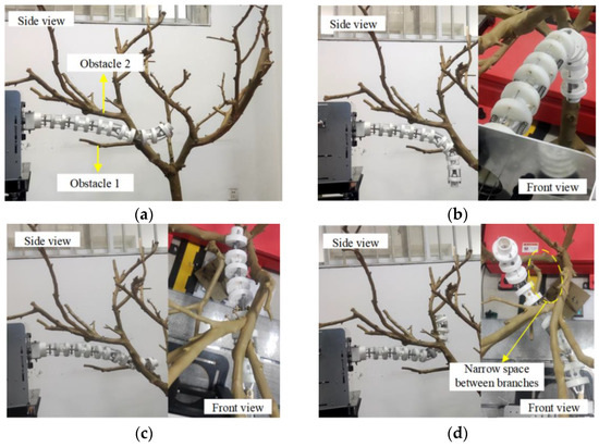 The experimental process is demonstrated in Figure 12. After placing the model tree into the workspace of the manipulator, the manipulator firstly avoided obstacle 2, then passes through the narrow space between obstacles 1 and 2, and finally avoided obstacle 1 and entered into the canopy. The experimental results proved that the manipulator had a good obstacle avoidance performance that could avoid the branches and reach the inner part of the tree canopy.