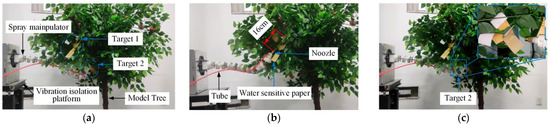 The pest-affected areas of the tree canopy were the targets of the spraying. To verify the effects of the cable-driven flexible spray manipulator, a target-spraying experiment was performed on target 1 in the middle of the canopy and target 2 in the inner canopy in turn, as shown in Figure 13. The height of the model tree was 1.67 m. The canopy height ranged from 0.69 m to 1.67 m and its diameter was 1.53 m. The mass of the nozzle was 10.6 g. The end of our manipulator did not have an extra load and the tube was evenly distributed on the manipulator. The manipulator moved smoothly throughout the entire operation.