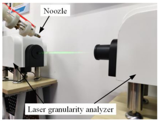 As shown in Figure 14, the droplet size was tested using a laser granularity analyzer. The spray angle was 60° and the diameter of the spray hole was 0.8 mm. When the spray flow rate was 4.0 mL/s, the droplet diameter was 97.617 μm. The droplets were collected on water-sensitive paper and data processing was conducted to obtain the deposition and coverage rate of the droplets, as shown in Table 4.