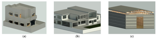 Model of the case study buildings: (a) House; (b) Office; (c) Warehouse.