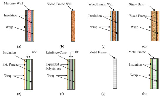 Different types of walls for office and warehouse buildings. (a) WO2: Masonry wall with insulation; (b) WO3: Wood wall without insulation; (c) WO4: Wood wall with insulation; (d) WO5: Straw bale wall; (e) WO6: Structurally insulated panel; (f) WO8: Insulated concrete foam; (g) WH1: Metal frame wall without insulation; (h) WH2: Metal frame wall with insulation.
