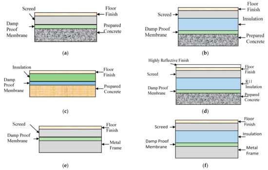 Similarly, various types of roof materials were investigated for the office and warehouse buildings (Table 6 and Table 7). Figure 3 shows the schematic of various types of tested roofs. Wall materials for the office building were also tested for the house building.