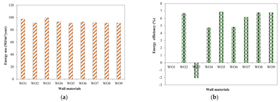 Effect of wall materials on energy use in tested office building. (a) Energy use; (b) Efficiency.