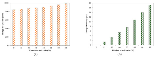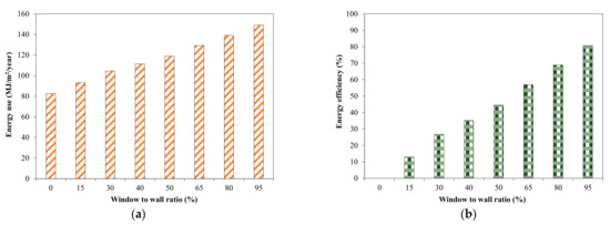 Effect of W/W ratio in energy use in tested house. (a) Energy use; (b) Efficiency.