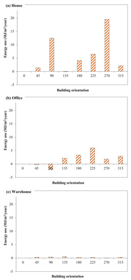 Effect of building orientation in energy use. (a) House; (b) Office; (c) Warehouse.