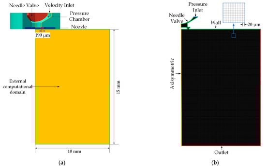 Figure 1a shows the diagram of the UWS injector and the fluid domain of the primary breakup. The fluid domain consists of the internal fluid domain (including pressure chamber and nozzle) and external domain of the primary breakup. The liquid phase of the non-air-assisted injector generally exists in the form of a liquid column or liquid sheet in the near-field region. As the diameter of the nozzle is small (Φ 190 μm), and the primary breakup only occurs in the near-field region of the nozzle exits, obtaining a clear interface requires a high-resolution grid. In order to increase the computational efficiency, the geometric model is appropriately simplified into a two-dimensional axisymmetric structure. Figure 1b shows the computational grid and boundary conditions. The yellow boundary represents the symmetric boundary condition, the blue boundary is the pressure inlet, the green boundary corresponds to the wall, and the red boundary is regarded as a pressure outlet, which relates to the atmosphere. The fluid domain of the primary breakup is divided into structured meshes, and the element size is 20 μm. The commercial CFD software FLUENT is adopted to solve the continuity equation, momentum conservation equation and VOF equation to simulate the primary breakup process. LES WNLES S-Omega is employed as the turbulence model to increase the forecast precision. A previous study [9] has demonstrated that water spray and UWS spray behave similarly in terms of bulk spray properties. Therefore, water is selected as the injected fluid in this work to study the spray characteristics. The boundary conditions of the primary breakup process and material properties are shown in Table 1.