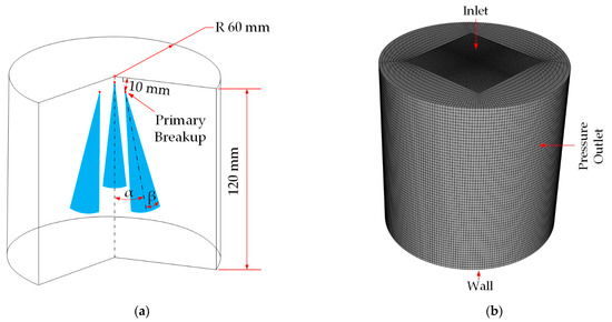 Figure 2 shows the fluid domain of the droplet development process. Figure 2a compares the size relationship of the fluid domain between the droplet development and the primary breakup, and Figure 2b shows the computational grid and boundary conditions of the model. The diameter and the height of the cylindrical computational domain are 60 and 120 mm, respectively. The computational domain is adopted to O-shaped subdivision, and local refinement is performed in the central region. The minimum element size is 1 mm. Realizable k-ε is selected as the turbulence model for the droplet development process, since the LES model cannot be applied to two-way coupling interaction. The degree of secondary breakup of the droplets was evaluated by the Taylor analogy breakup (TAB) model. The droplets generated by the primary breakup are processed into groups of droplets, and the droplet groups are loaded at the position where the primary breakup takes place, as shown in Figure 2a. The results of the primary breakup (droplet size, inclination angle, and average velocity, etc.) are used as the initial conditions for the droplet development process. Table 2 shows the parameters of the droplet development process.