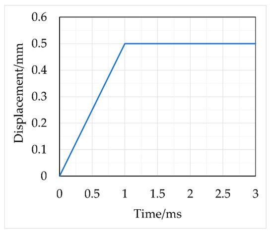 Initially, the primary breakup process of the injector with the needle valve movement is studied. The motion of the needle valve is simplified as a uniform motion. Figure 3 exhibits the displacement curve of the needle valve.