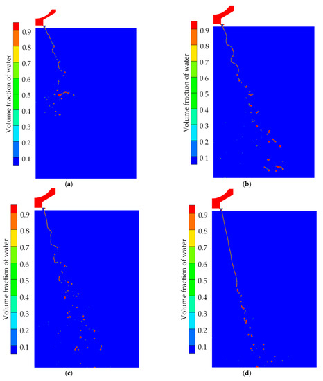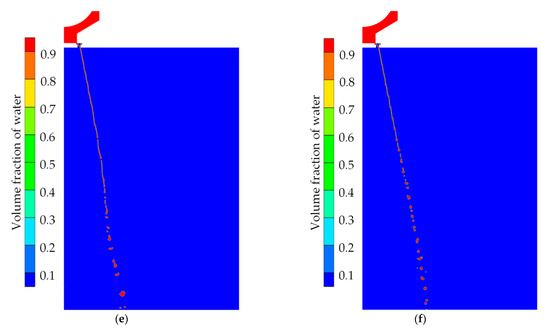 Figure 4 shows the development and breakup of the liquid jet at different times when the inlet pressure is 0.6 MPa, where the volume fraction of the phase interface is 0.5. With the opening of the needle valve, the liquid flows obliquely from the pressure chamber into the nozzle and finally sprays into the static air. The jet is subjected to the interaction of aerodynamic force, viscous force, and surface tension, resulting in an impact of the jet front, and then, surface waves are generated and transmitted to the upstream of the liquid jet. The length of the liquid column gradually develops until the aerodynamic force overcomes the resistance of the liquid surface tension and viscous force, and then, the liquid column becomes unstable and fragments, forming ligaments and small droplets. The breakup process of the liquid jet can be divided into two stages. In the first stage, the liquid column shows a periodic fluctuation with an intense amplitude, as shown in Figure 4a–c. The periodic fluctuation of the liquid jet tends to be gentle, and the breakup process tends to be stable in the second stage, as shown in Figure 4d–f.