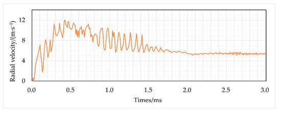 Figure 5 explains the cause of the difference in the primary breakup. The pressure field inside the nozzle is constantly changing, due to the movement of the needle valve. The variation of the pressure field leads to a periodic fluctuation of the initial radial velocity of the jet (the radial velocity at the nozzle exit), and then causes the periodic radial disturbance of the liquid jet in the first stage. When the needle is stationary (at top dead center), the pressure field in the injector as well as the liquid distribution in the nozzle tend to be relatively stable, the radial velocity fluctuation weakens and tends to fluctuate in a small range, and the primary breakup is dominated by asymmetric surface waves.