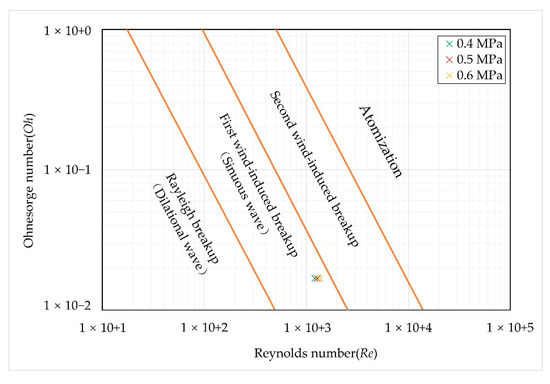 where d0 and u0 denote the diameter and average axial velocity of the jet at the nozzle exit, respectively. As shown in Figure 6, Reitz et al. [32] divided the breakup modes of the liquid jets into four categories based on the Re number and Oh number, which are Rayleigh breakup, first wind-induced breakup, second wind-induced breakup and atomization. When a criterion of the Re and Oh is considered, the cases of primary breakup in this study should be in the first wind-induced breakup regime.