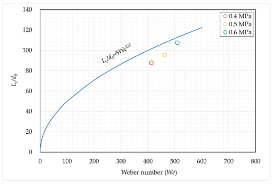 The average breakup length (Lc) of a liquid jet is one of its important characteristic parameters. Sallam et al. [33] summarized the empirical equation for the average breakup length of common liquid jets (such as water and ethanol) based on previous studies: