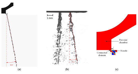 The inclination angle of the liquid jet refers to the angle between the liquid jet and the axis of the nozzle. Figure 8 shows the comparison between the numerical simulation result and the experimental result of Kapusta et al. [15] for the inclination angle at an inlet pressure of 0.5 MPa. The comparison shows that both are well consistent. In addition, the inclination angles were also measured at inlet pressures of 0.4 and 0.6 MPa. The results show that the inclination angle is insensitive to the inlet pressure, which is about 9.9° under all operating pressures. The inclination angle is related to the deviation of the connected domain from the axis of the nozzle, as shown in Figure 8c.