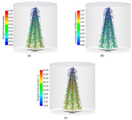 Figure 9 shows the droplet diameter distribution, aerodynamic Weber number distribution and velocity distribution at an inlet pressure of 0.6 MPa. In the simulation of the droplet development process, about 2.7 million parcels are introduced in the computational domain, and only 3‰ of parcels are illustrated for a clear representation. According to the study by Li et al. [25], for a droplet to fragment, its aerodynamic Weber number should exceed a critical value (Weg,crit = 12). However, it can be seen from Figure 9b that the maximum aerodynamic Weber number of the droplet is 2.69, which is much smaller than the critical value of the secondary breakup. Thus, the droplet hardly undergoes secondary breakup. It can be concluded from Equation (13) that the aerodynamic Weber number is affected by two variables: the droplet diameter and the gas–liquid relative velocity. Since the droplet diameter of the primary breakup is very small (6–300 μm), only when the relative velocity is large enough, can the aerodynamic force overcome the surface tension of the droplet. However, the object of this study is a low-pressure injector; thus, the relative velocity cannot meet the condition of a secondary breakup. That is to say, the droplet size distribution of the primary breakup determines the droplet size distribution characteristics of the spray. In addition, it can also be observed from Figure 9 that the velocity of the droplet with a larger diameter is relatively high, that is, the deceleration effect of the aerodynamic force on small droplets is more obvious.