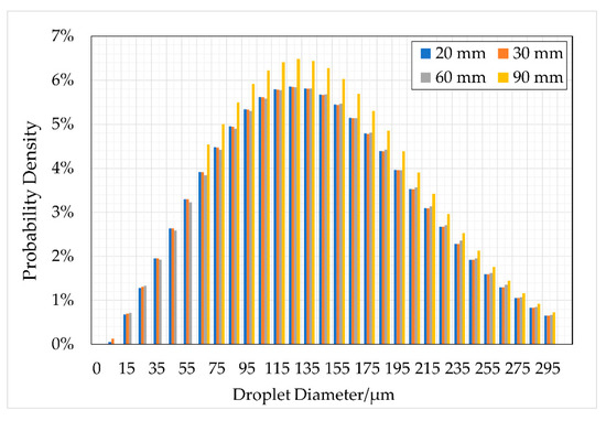 The droplet size distribution at 20 mm from the nozzle exits is measured at an inlet pressure of 0.5 MPa and is compared with the experimental result by Kapusta et al. [15], as shown in Figure 10. The droplet size distribution of the simulation is in good agreement with the experimental result. The Sauter Mean Diameter (D32) measured by the simulation and experiment is 103.2 and 106.6 μm, respectively. The accuracy of the simulation of the droplet development process is verified by comparing with the experimental results. In addition, the droplet size distribution at 30, 60 and 90 mm from the nozzle exits is also measured by the simulation. As shown in Figure 11, the droplet size distribution at 20, 30, and 60 mm from the nozzle exits remains almost unchanged, confirming that there is almost no secondary breakup of droplets. In other words, the droplet size distribution is mainly determined by the primary breakup. With the increase in axial distance (90 mm from the nozzle exits), it is hardly meant to count droplets less than 55 μm. This is because the inertia of small droplets is small, and they are more likely to be decelerated by aerodynamic force than large droplets.