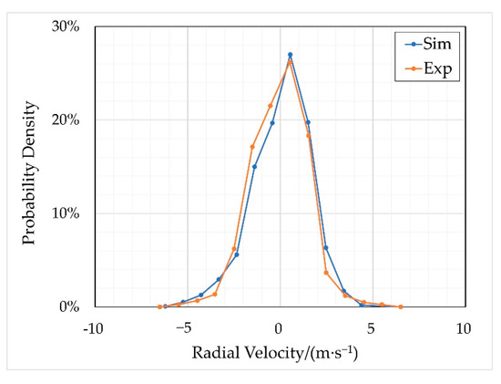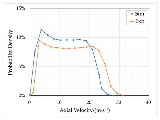 Figure 12 and Figure 13 show the probability density curves for the droplet velocity in the radial and axial components, respectively, which are compared with the experimental data of Bracho et al. [16]. The results show that the simulated radial velocity distribution is consistent with the experimental data. For the axial velocity, the simulation underestimates its distribution range compared with the experiment. This is because the average velocity of the primary breakup is used as the initial condition of the droplet development process, such that a small number of droplets with higher initial velocity are ignored in the simulation of the droplet development process. However, the characteristic of axial velocity distribution is consistent between the simulation and the experiment.