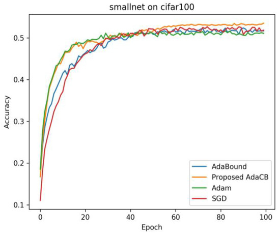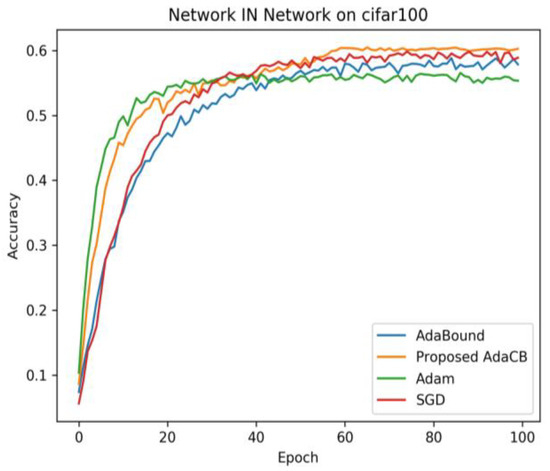 Figure 5, we can find that Adam has the fastest convergence speed in the early stage and the worst testing accuracy in the end. AdaCB is second only to Adam in convergence speed in the early stage, and it finally achieves the best testing accuracy on CIFAR100 under Network IN Network architecture. Adabound has a comparable convergence speed with SGD (M) before 20 epochs, and SGD (M) wins Adabound eventually.