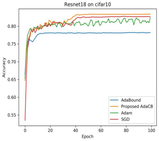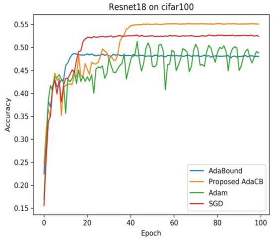 Figure 7, the testing accuracy of Adam is fluctuating on CIFAR10 and CIFAR100 under Resnet18 architecture. Adabound produces a smooth curve of testing accuracy, but its testing accuracy is the worst. AdaCB achieves the best testing accuracy, followed by SGD (M), Adam, and AdaBound. The results are shown in