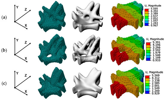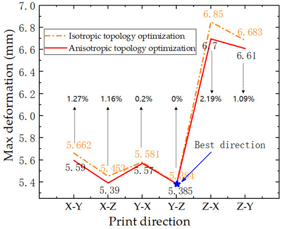 - The deformation obtained by anisotropic optimization was about 1.09–2.19% smaller than that obtained by isotropic optimization. Therefore, when topology optimization is combined with additive manufacturing, it is necessary to consider the performance difference caused by the printing orientation.