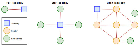 An IoT network is a representation of the distribution of its nodes in space and how they interconnect. The most used topologies are point-to-point, star, and mesh, as depicted in Figure 2 [18].