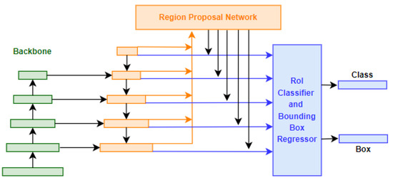 Faster R-CNN is a two-phase model because it includes two phases: first, it looks for the Regions of Interest (RoI) to predict if an object exists; then, using that RoI, it predicts the object’s class and coordinates. This model has three main steps. The backbone is where a Feature Pyramid Network (FPN) obtains the feature maps of the images. The Region Proposal Network (RPN) predicts the RoI, that is, the regions that have objects and their coordinates. Lastly, there are the RoI classifier and the bounding box regressor. The first classifies each object in the bounding boxes (regions that have an object). The latter improves predictions for the dimensions of those boxes [23] (see Figure 3).
