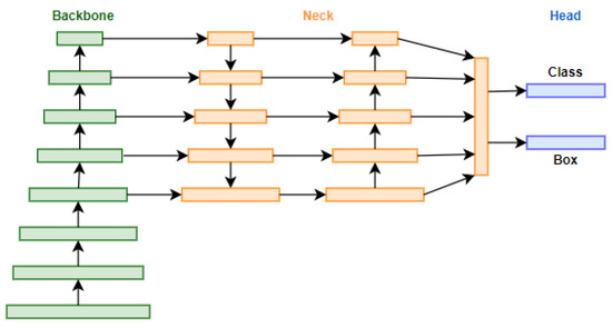 YOLOv5 is one of the most recent YOLO models and like the other YOLO models, is a one-phase model because it only takes one look at the images, i.e., this model does not first look for the RoI and then process that area. Instead, it makes the classification and prediction all at once. It has three main steps. First, there is a backbone where a Cross Stage Partial Network (CSPN) extracts the most relevant features. Then, a neck generates feature pyramids using a Path Aggregation Network (PANet) to obtain new and better feature maps, i.e., features maps that combine the same information with different scales. The final step is the head (see Figure 4), which is used to acquire the bounding boxes from the feature maps, classify them, and predict their coordinates [25].