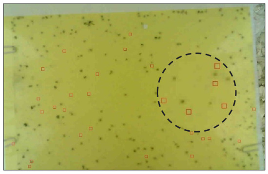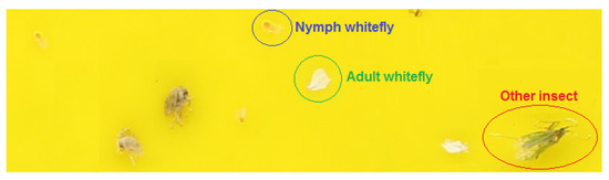 To train the computer vision models, we used a public dataset [27] that contains 284 images (5184 × 3456) of yellow sticky traps with WF and other insects (Figure 5). The dataset contains 4940 annotated WF instances and, as described by the dataset authors [27], some unannotated or improperly annotated instances. This affects the precision of CV models, as the detection of an unannotated instance is classified as a False Positive detection. To improve the dataset, we contacted technicians and, with their help, we annotated the missing WF instances. From that process, the total annotations passed from 4940 to 5863 WF instances. Finally, we divided the whole dataset into a training (80%) and a testing (20%) dataset.
