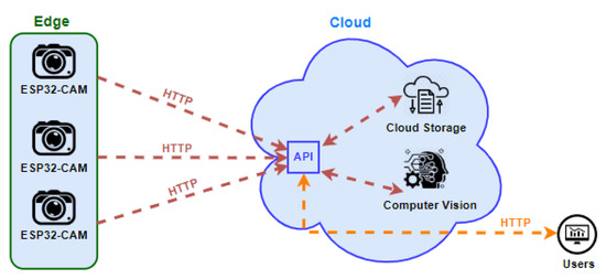 As depicted in Figure 6, we developed a star topology network with cameras (at the edge) placed in crops, the backend centralised in a private cloud, a pest monitoring application for the users obtain insights, and all communications using the HTTP protocol. The chosen architecture (star topology) allowed the development of a very efficient and inexpensive network. Furthermore, this type of topology allows us to easily scale the network to other crops just by adding new edge devices. The cameras used at the edge (ESP32-CAM), although low cost, allow the obtaining of images with enough quality to not influence the performance of the CV models.